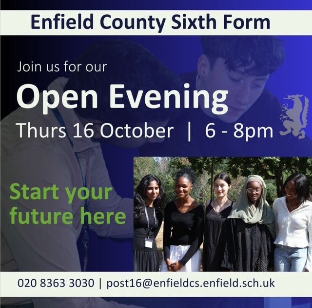 Ready to take the next step after Year 11? Join us at our Sixth Form Open Evening and discover the A level and BTEC opportunities waiting for you. - Explore a wide range of courses tailored to your ambitions - Meet inspiring teachers and current Sixth Form students - Learn about pathways to university, apprenticeships, and careers - Get a feel for life at our vibrant Sixth Form community This is your chance to shape your future and discover why Enfield County Sixth Form is the right choice for you. Enfield County Sixth Form Holly Walk (upper site), Enfield EN2 6QG For more information contact a member of our Sixth Form Team: Sixth Form Mobile number 07867 310 455 OR email: [email protected]