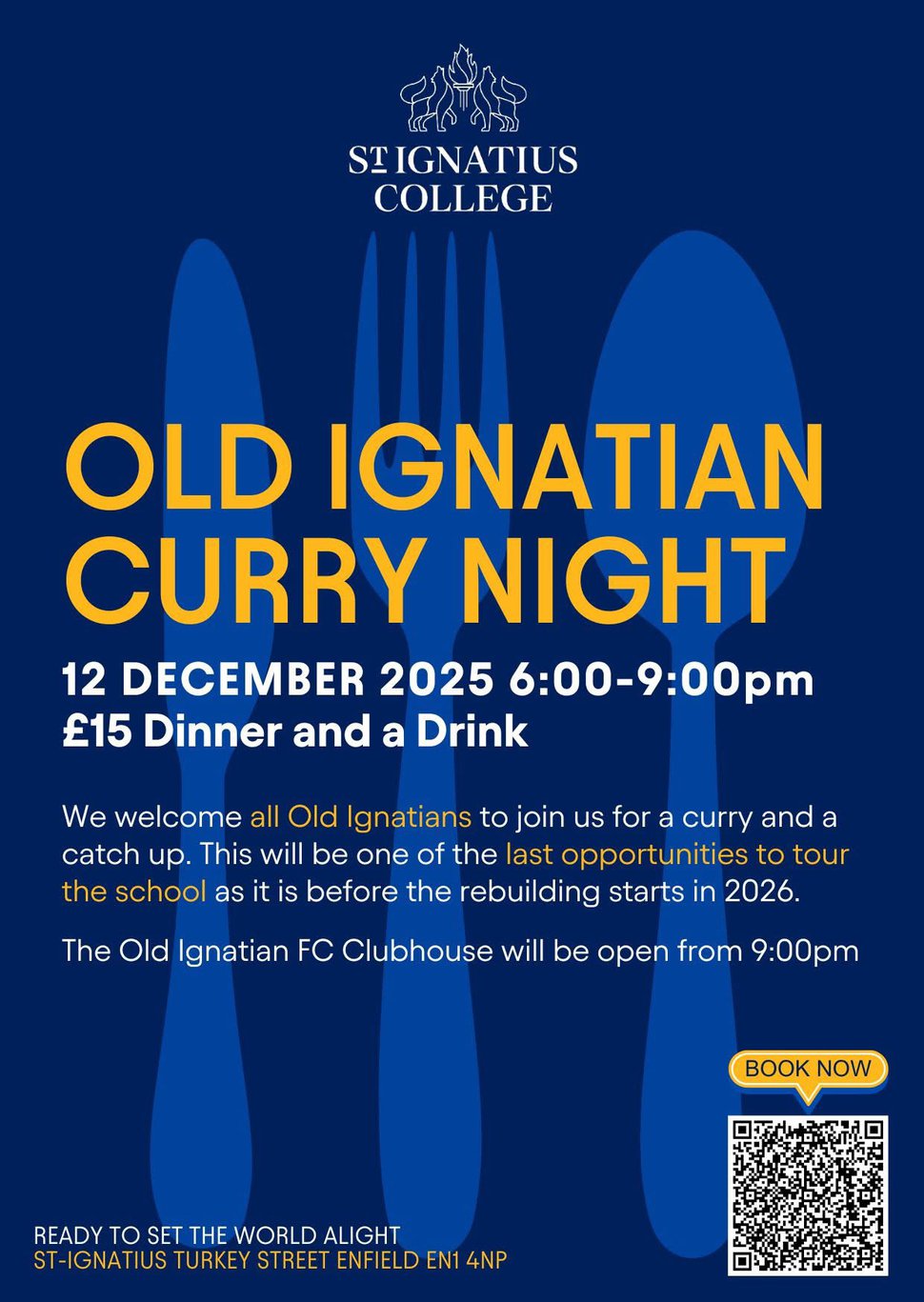 We are happy to announce that tickets for our alumni Curry Night are now on sale. We warmly invite all Old Ignatians to enjoy a meal with friends, catch up with old faces and to tour the school in it's current state before the School Rebuilding Programme gets started in 2026. Whether you just left or haven't been here for many years, we invite you to join us for a curry, to tour the school and to view the plans for the new building. Following the event, there will be an opportunity to to continue socialising at the Old Ignatian FC clubhouse. Contact [email protected] with any queries