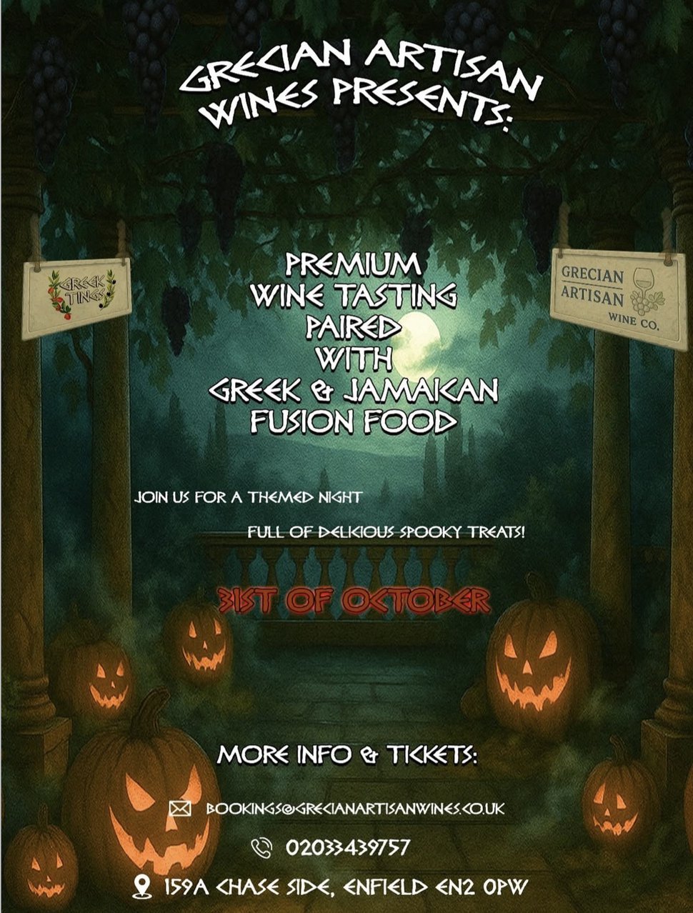A spooktacular night of premium wine tasting paired with Greek & Jamaican fusion food!