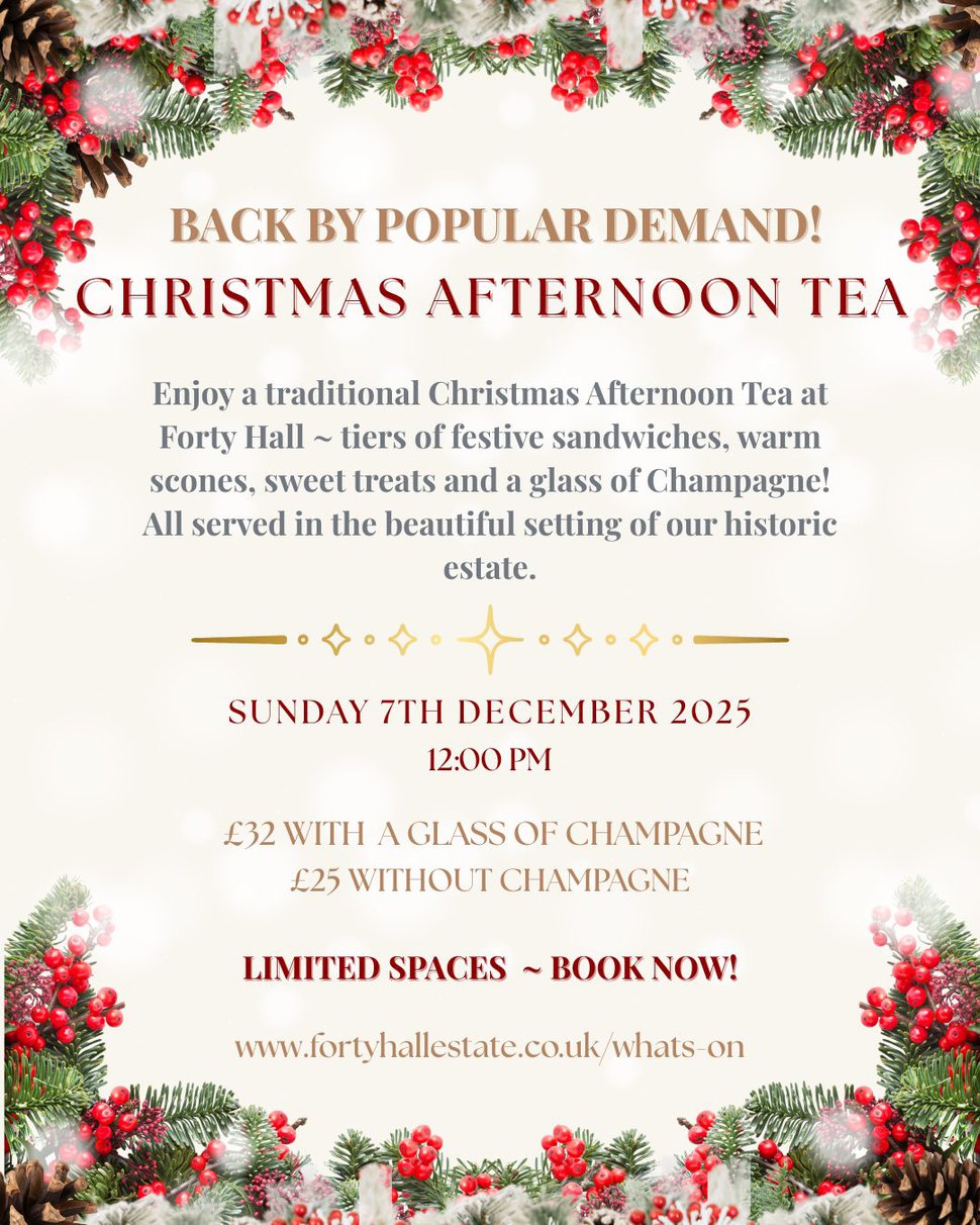 The Banqueting Suite at Forty Hall will be opening its doors to serve you a sumptuous afternoon tea alongside a chilled glass of Champagne, English breakfast and assorted herbal teas. With the beautiful Forty Hall estate as your backdrop what better way to relax and celebrate the festive period.