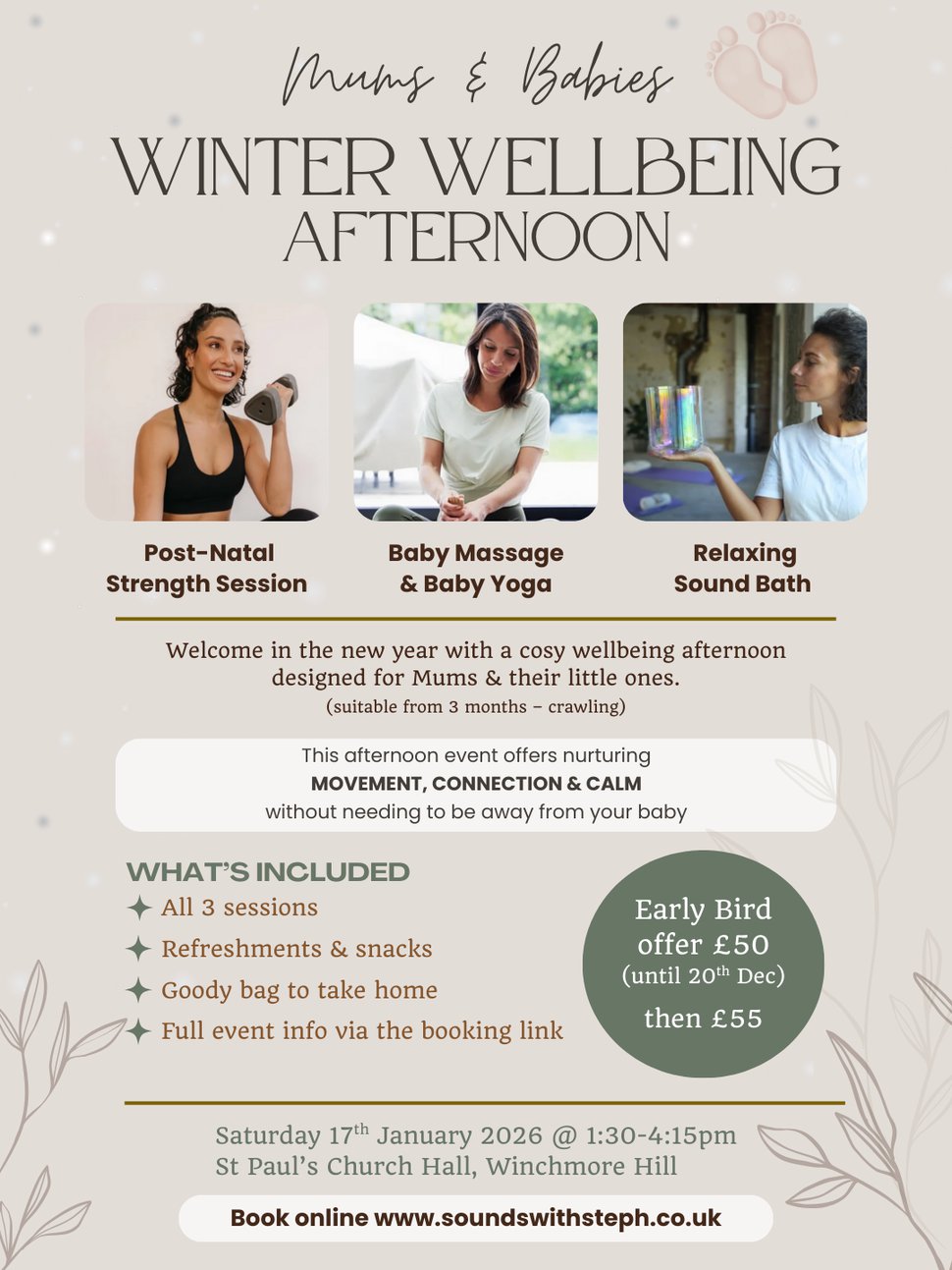 This afternoon is designed to support your body, mind and nervous system while keeping your baby close by. Expect gentle movement, bonding time and deep relaxation in a welcoming, baby-friendly space.