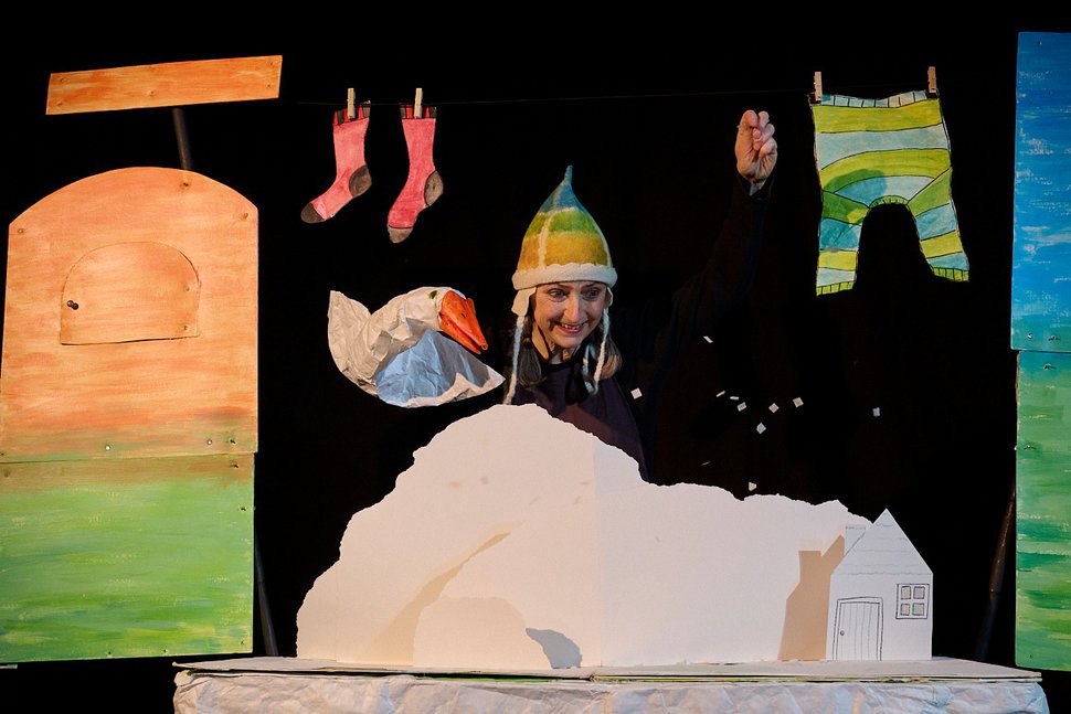 The Goose and Mrs Frost is a family theatre show told with one performer, a giant pop up book and colourful paper puppets. It has a seasonal, winter theme drawing on traditional folk tales and is suitable for children age 3+ and their families.