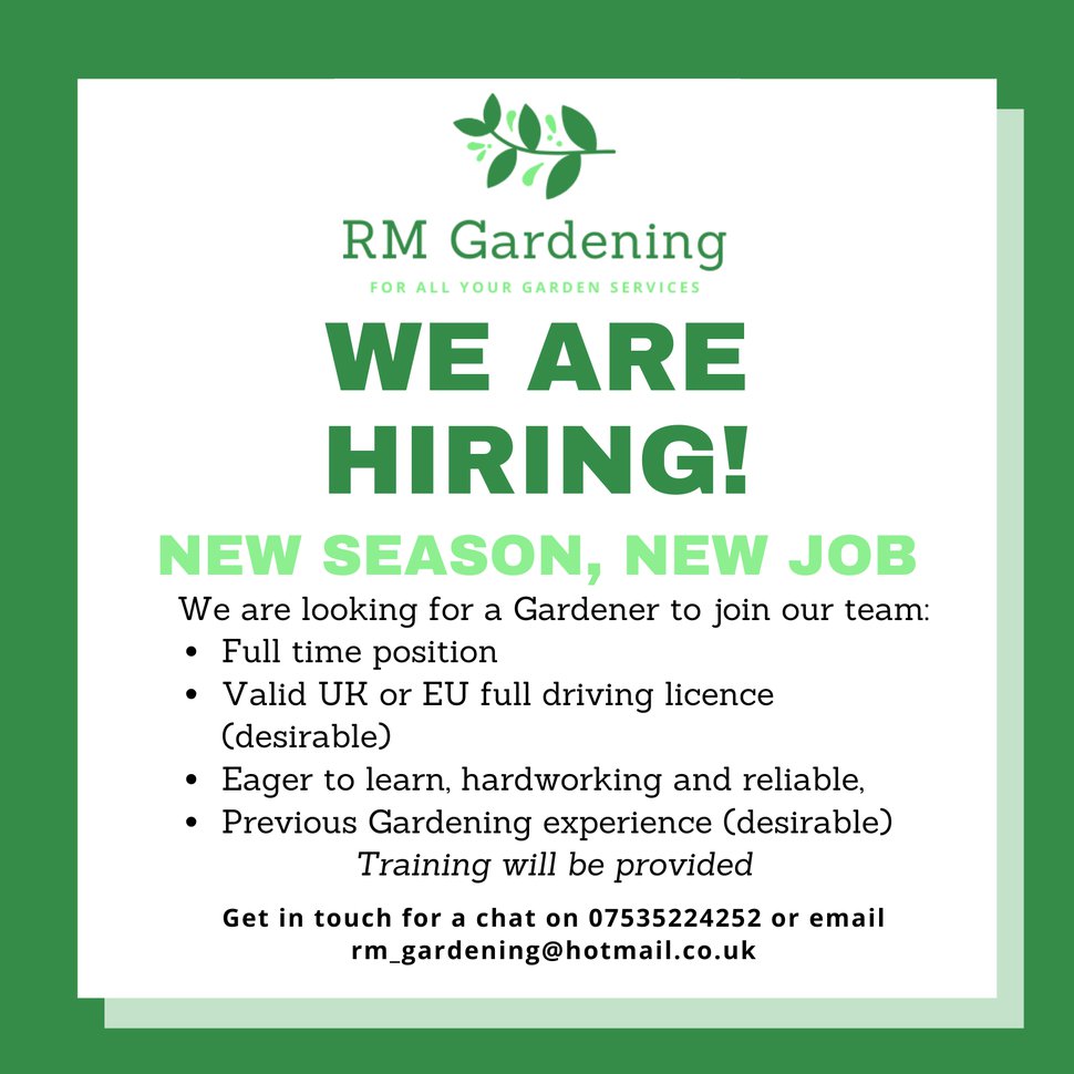 Full time position Valid UK or EU full driving licence (desirable) Eager to learn, hardworking and reliable, Previous Gardening experience (desirable) Training will be provided
