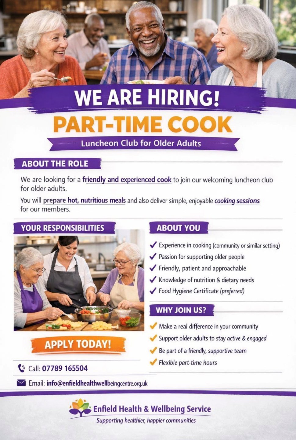 We are looking for a friendly experienced cook to join our welcoming luncheon club for older people. You will prepare hot, nutritious meals and also deliver simple, enjoyable cooking sessions for our members. About you - Experience in cooking (community or similar setting) - Passion for supporting older people - Friendly, patient and approachable - Knowledge of nutrition and dietary needs - Food hygiene certificate (preferred) If you love cooking and want to make a real difference in your community, we'd love to hear from you!