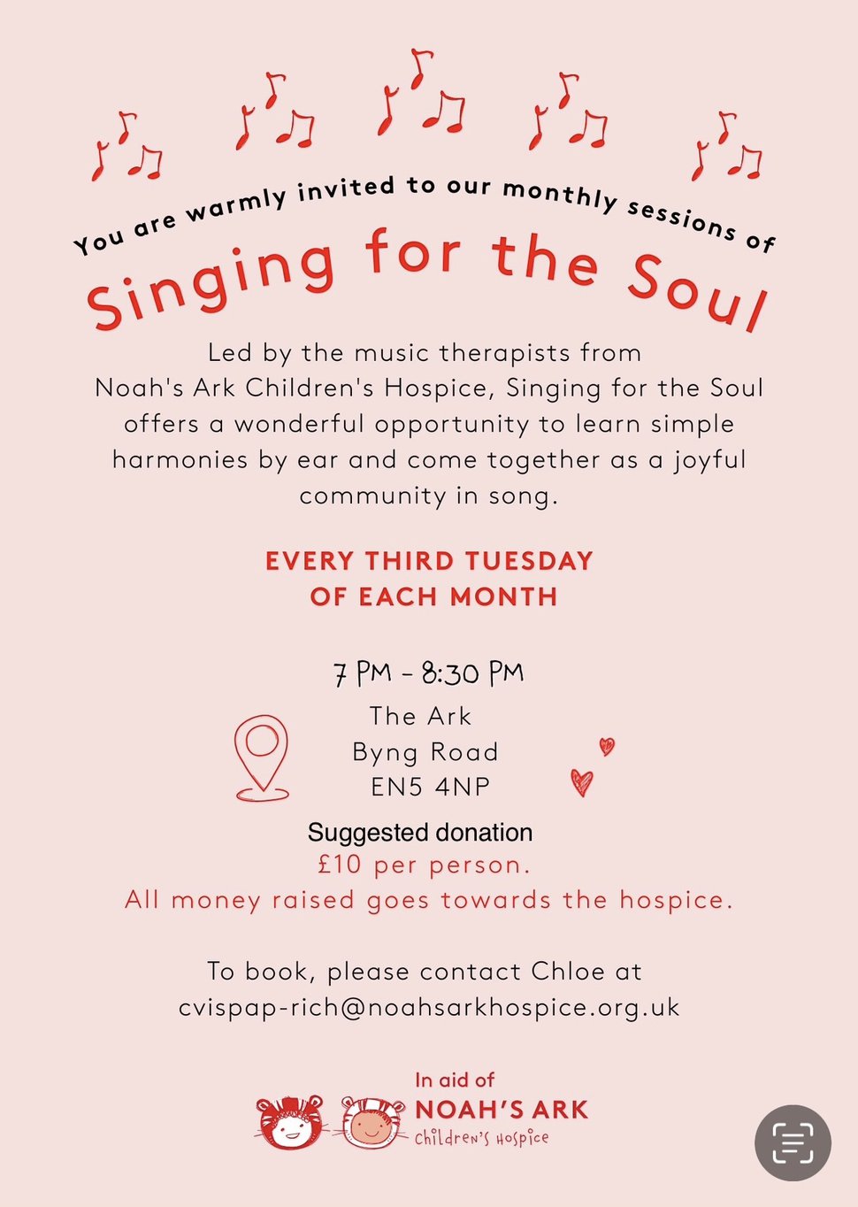 You are warmly invited to Singing for the Soul, a joyful and uplifting monthly singing session led by the music therapists from Noah’s Ark Children’s Hospice.