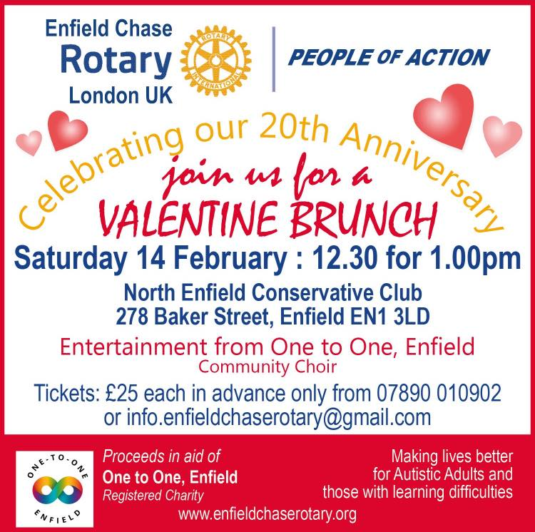 Enfield Chase Rotary are celebrating their 20th anniversary by hosting a valentines brunch. Tickets must be booked in advance.